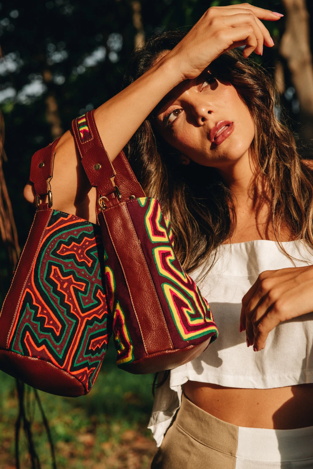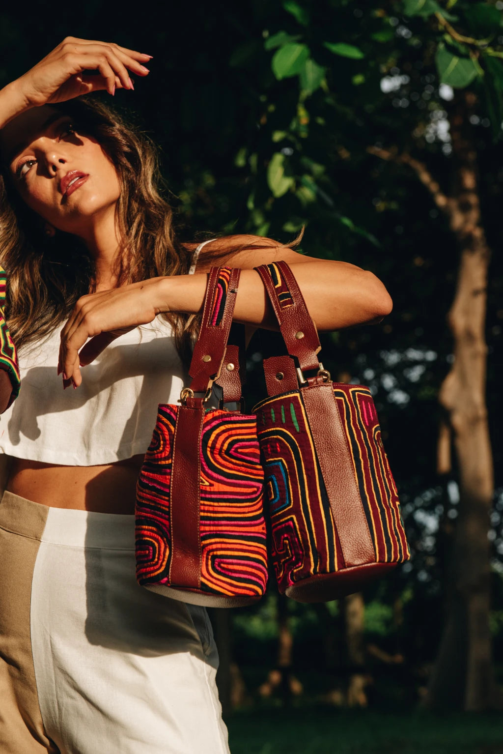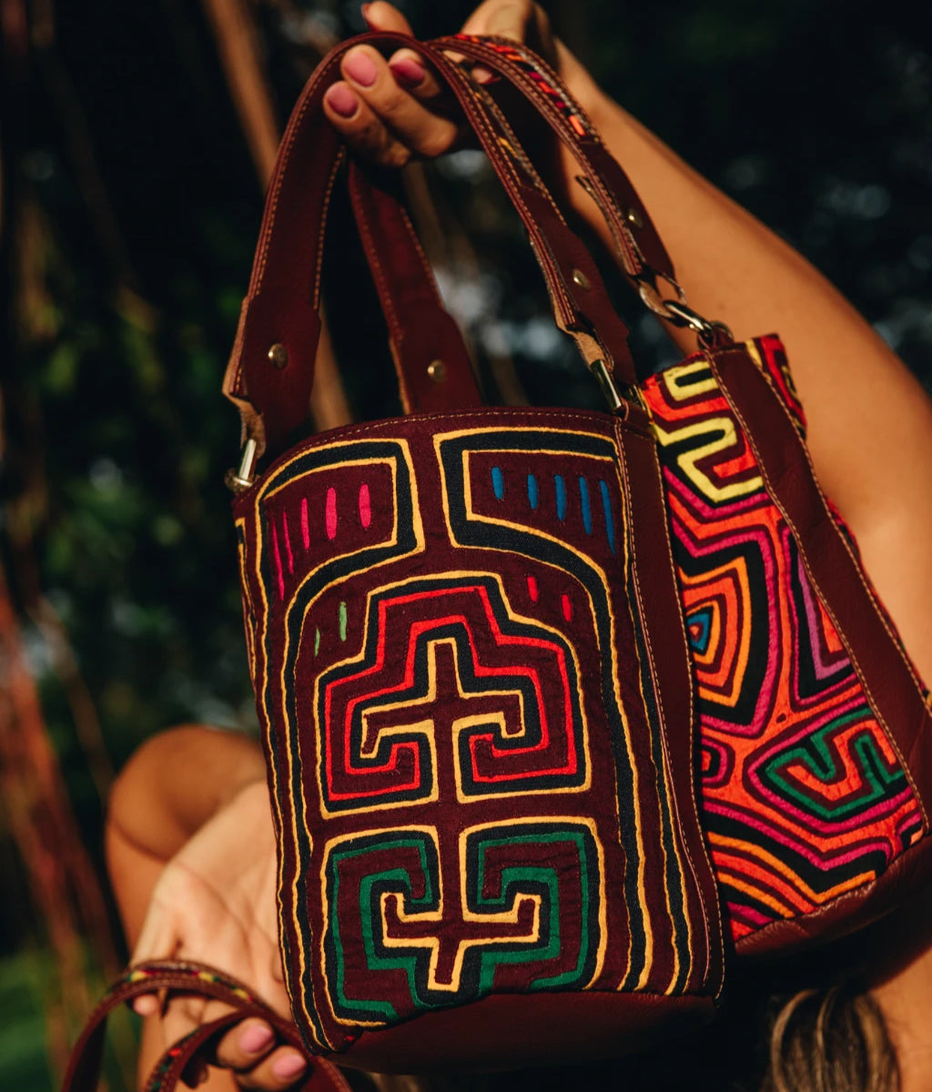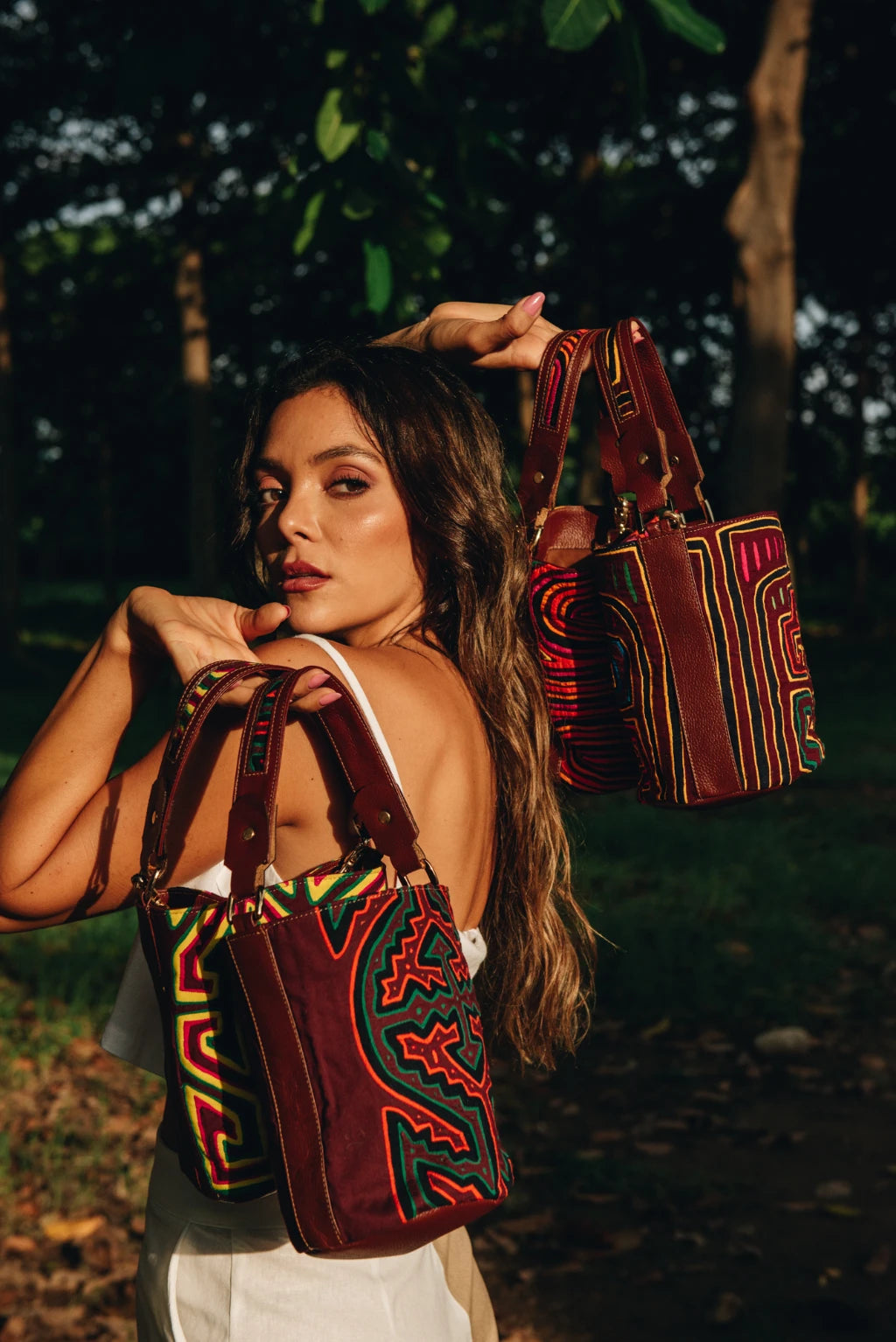 Elaboración 100% artesanal una obra de arte fabricada por manos de indígenas de la comunidad Gunadule en Colombia, en donde las mujeres con hilos agujas y trazos de manera delicada crean las molas; su tejido ancestral. Puedes encontrar algunos imperfectos ya que es completamente hecha a mano. Para dar vida a una pieza única e ideal para complementar nuestros outfits. Nuestra Dulé, es hecha en mola con cuero, su forro interno en gamuza. Cuanta con una asa en cuero y una tira en cuero removible para llevar de la mano o colgada.